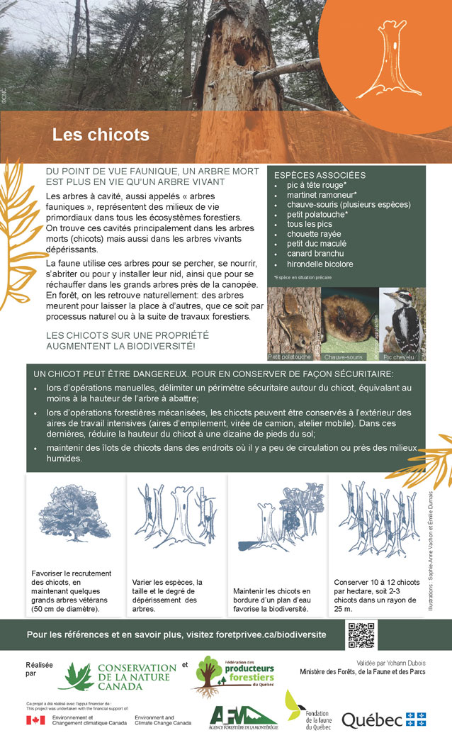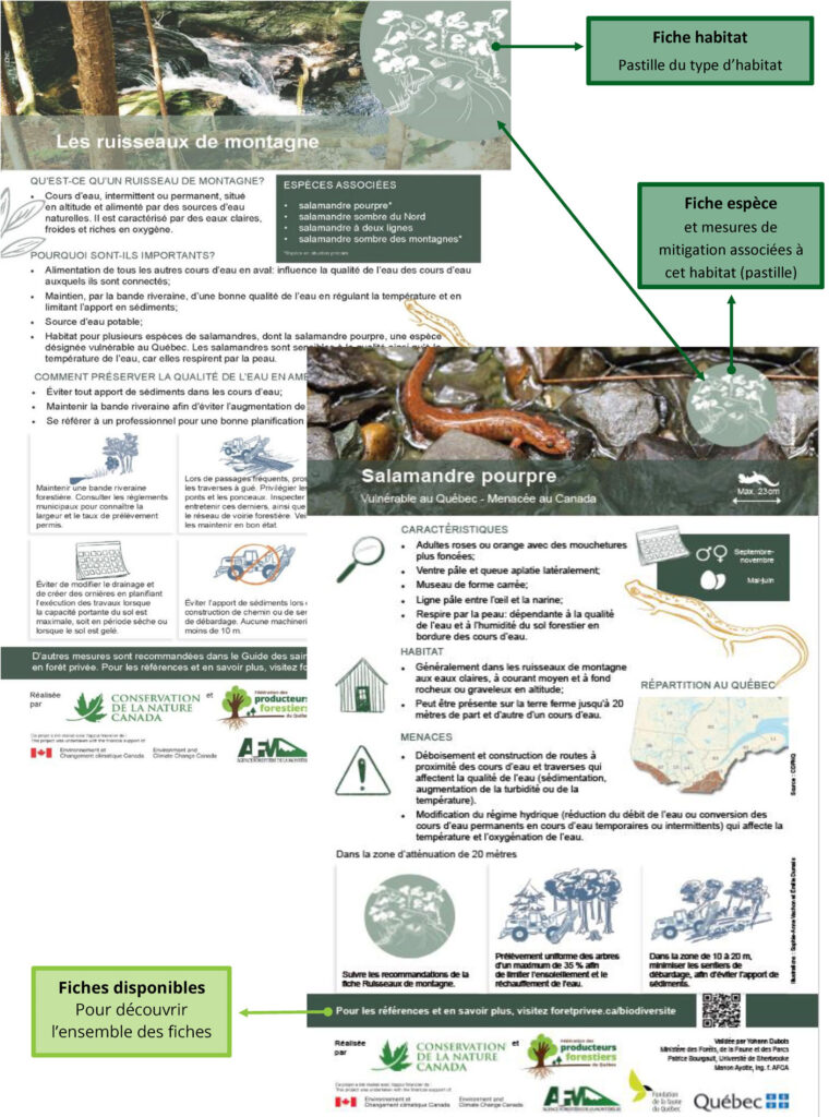 Les fiches recensent les habitats ou les espèces abritées dans les forêts privées et suggèrent des modalités d’intervention qui permettront le maintien de la biodiversité. Les conseillers forestiers pourront bonifier le plan d’aménagement forestier du propriétaire à l’aide de l’une ou l’autre des fiches développées.