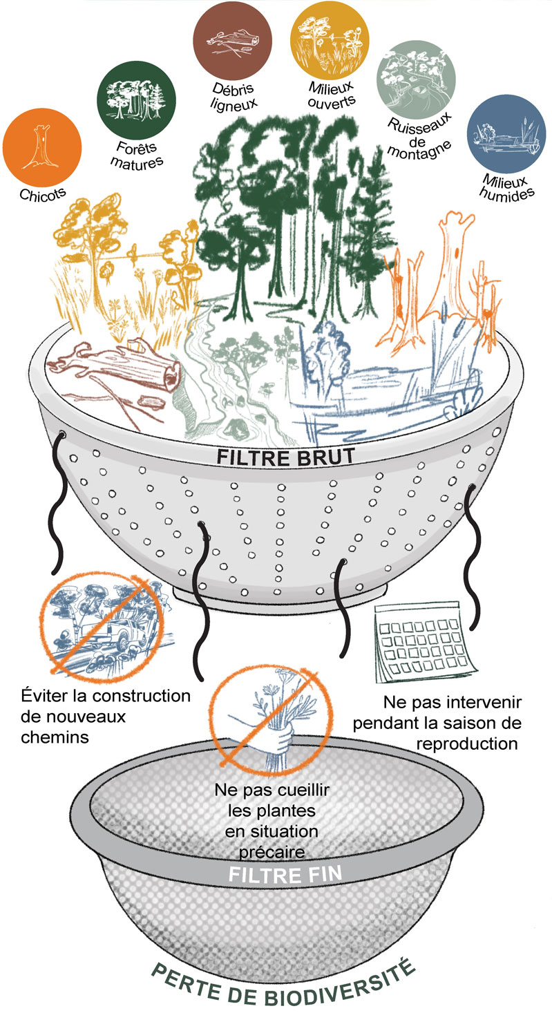 Les propriétaires de lots boisés peuvent ainsi protéger les milieux sensibles et maintenir la biodiversité tout en réalisant des activités d’aménagement forestier. Dès l’étape de la planification, on peut identifier deux grandes stratégies pour atteindre ces objectifs. D’une part, nous pouvons appliquer le concept de filtre brut qui vise à conserver la qualité des habitats, et d’autre part, nous pouvons appliquer le concept de filtre fin qui se définit par l’application de mesures spécifiques d’intervention visant à protéger certaines espèces nécessitant des besoins particuliers.